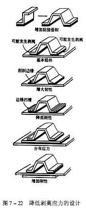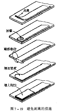 當薄壁構件與較厚板材粘接時,即平面粘接接頭,尤其是接近端部,對剝離力特別敏感,若受到橫向的剝離力首先容易脫開,并導致整個粘接縫的破壞。剝離通常是從膠層邊緣開始的,因此可以采取端部加鉚、卷邊、加寬、增剛等方法避免,如圖7-19所示。加鉚時鉚釘應靠近接頭頂端,鉚釘孔必須加大,并涂膠封閉,使端部以剛性約束,鉚釘起到防止膠層剝離的作用。
