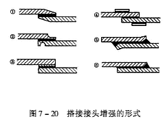 ![]() 為使薄板粘接做得剛性更大些,通常采用凸緣接頭形式,通過增大粘接面積,增加凸緣柔韌性和增加薄板剛性,可提高粘接體系抗彎曲的能力,見圖7-22。
