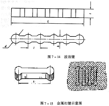 對于大型設備受力較大的裂紋、裂縫及損壞的修復,只用粘接不會牢靠,應當是粘接加上金屬扣合,修補才能牢固耐久,這就要用到波浪鍵或金屬扣(見圖7-14和圖7-15)。采用波浪鍵增強粘接的效果比較好,對機件壁厚大于8mm,承受1~6MPa壓力的機件裂紋或斷裂的修復,必須以一定數量的波浪鍵進行加固增強。波浪鍵制作比較復雜,一般并不常用。