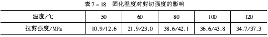 為了獲得較高的粘接強度,一般需要加熱固化,其強度可提高50%~100%,這也是粘接增強的一種好方法。加熱固化有利于大分子進一步擴散、滲透、纏結,使化學反應更加完全,提高固化程度和交聯程度,減小蠕變,這些都能使粘接強度大幅增加。總之,加熱可使固化更充分,強度更增大(見表7-18)、粘接更牢固。