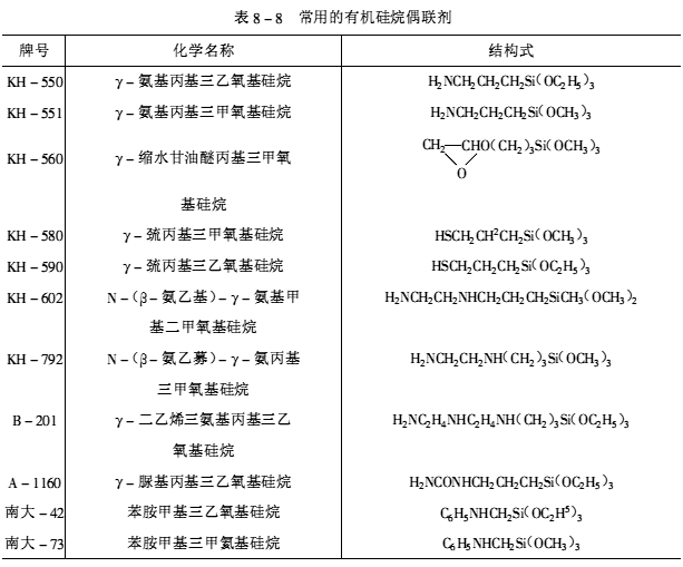 多年來的實踐表明,在環(huán)氧膠黏劑和粘接過程中使用偶聯劑能夠極大地提高粘接強度、耐水性、耐熱性和耐濕熱老化性,從而使粘接結構更為可靠耐久,這是提高粘接耐久性最簡單、最有效的方法,可使耐久性提高1~2倍(也有說4~7倍),見圖8-7。常用的偶聯劑為有機硅烷偶聯劑,如表8-8所示。