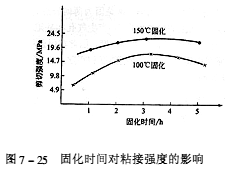 (9)固化時間 任何固化過程都需要一定時間,如果固化時間不足,則固化不會完全,粘接強度必然要低。一般隨固化時間的延長粘接強度提高,但有一極限值(見圖7-25)。升高溫度可以縮短固化時間,如果低于特定的固化溫度,無論怎樣延長時間也是無濟于事。對于不同種類的環氧膠黏劑,必須給予一定的固化時間保證,才會獲得最大的粘接強度。