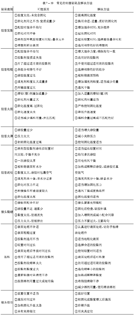根據缺陷的大小可分為宏觀缺陷和微觀缺陷,宏觀缺陷主要有:顏色變化、雜質、裂紋、裂縫、壓痕、起泡、小坑、起皺、焦化、分層、脫膠等。微觀缺陷有:微小氣孔、微裂紋、疏松結構等。宏觀缺陷往往是小面積的、局部的、不連續的,而微觀缺陷則是大面積的、連成片的。從大量的破壞實驗結果來看,真正引起結構破壞的還是微觀缺陷。表7-19列舉了常見的粘接缺陷及解決方法。