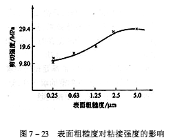 (2)表面粗糙程度 一般來說,被粘表面適當粗化能夠增大粘接面積,對提高粘接強度有利,如圖7-23所示。因此,在粘接之前表面都要進行打磨或噴砂。但是應當明確,表面不是越粗糙越好,過度的粗糙反而有害無益。由于表面凸凹過甚,界面接觸不良,膠黏劑不易濕潤、滲透,容易缺膠,包裹空氣形成缺陷會使粘接強度下降,尤其是對流動性差的環氧膠黏劑更為嚴重,所以粗糙程度也與膠黏劑的流動性有關。流動性好,表面可稍粗糙些。