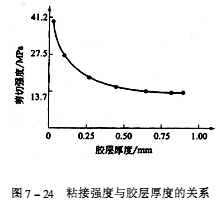 (5)膠層的厚度膠層厚度對粘接質量有顯著的影響,有些人誤認為膠層越厚,粘接強度越高,于是就多涂膠,其實恰恰相反,大多數膠黏劑的粘接強度都隨膠層厚度的增加而降低(見圖7-24)。例如某膠黏劑,當膠層厚度為0.06mm時剪切強度為36.0MPa;0.20mm時為33.7MPa;0.40mm時為25.7MPa。這是因為薄的膠層,需要更大的應力才能變形,不易產生流動和蠕變,界面上的內應力也小,產生氣孔和缺陷的概率較小。當然膠層過薄,容易缺膠,膠層不連續,也會降低強度和剛度。因此在保證不缺膠的前提之下,膠層厚度盡量薄些為好,通??梢缘玫阶畲蟮恼辰訌姸群蛣偠?。一般環氧膠的厚度以0.08~0.15mm為宜,不超過0.25mm。