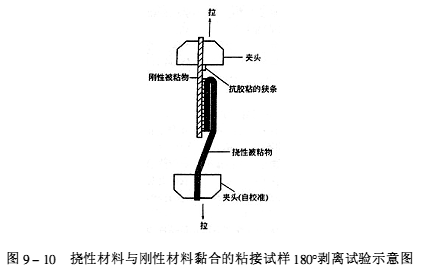 (5)試驗步驟 將撓性試片未粘接一端分開,按圖9-8(b)所示對稱地夾在上、下夾持器中。夾持部位不能滑移,以保證所施加的拉力均勻地分布在試樣的寬度上。開動試驗機,使上、下夾持器以(100±10)mm/min的速率分離。