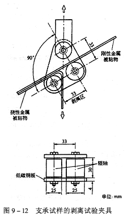 b.剝離試驗夾具支承試樣的夾具如圖9-12所示。夾具上端與試驗機上夾頭相聯。剝離試驗夾具上輥軸的直徑為25mm。輥軸兩端應由軸承組成,并可自由轉動。