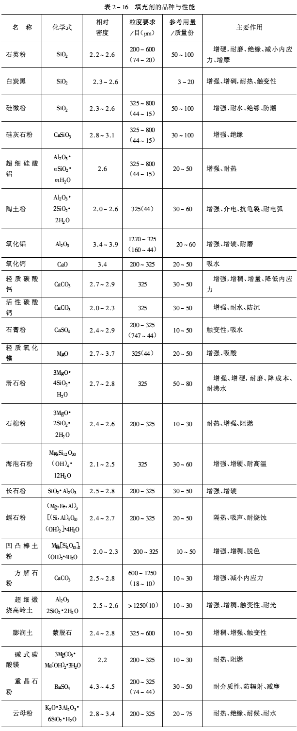 環氧膠黏劑所用的填充劑品種與性能見表2-16。