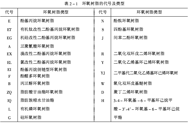 ①環氧樹脂是以1個或2個漢語拼音字母與2位阿拉伯數字作為型號,表示類別及品種。