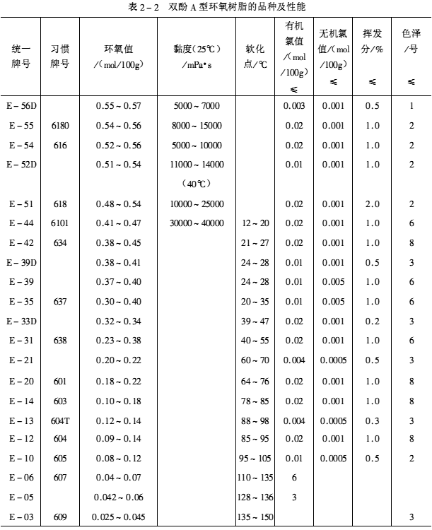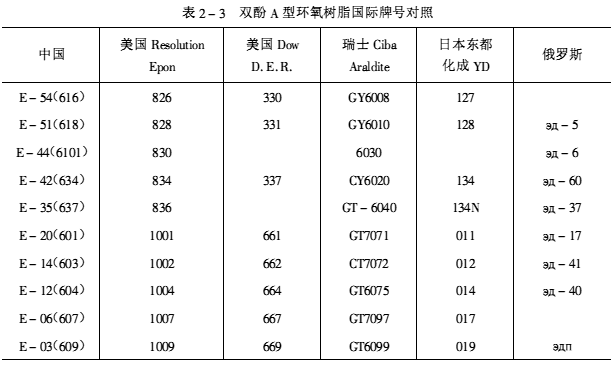 ![]() 目前所用的環氧樹脂有85%以上屬于雙酚A型環氧樹脂。表2-2列出了E型環氧樹脂的品種及性能。與國外同類產品牌對照列于表2-3。