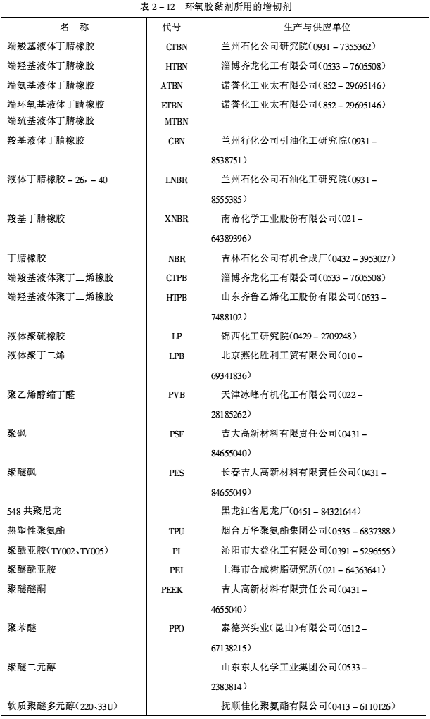 有些納米和晶須無機(jī)物會對環(huán)氧樹脂產(chǎn)生很好的增韌作用,同時還有增強(qiáng)效果,并且又可提高耐熱性。環(huán)氧膠黏劑所用的增韌劑如表2-12所示。