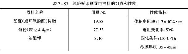 2.作為導(dǎo)體使用的導(dǎo)電涂料 線路板通常是在銅箔層壓板上把線路以外部分的銅箔蝕刻掉而制成的。這種方法工藝復(fù)雜,且造成銅箔的浪費和污染。利用導(dǎo)電涂料直接涂布于酚醛、環(huán)氧或玻璃鋼基板上,然后進行網(wǎng)板印刷,可更經(jīng)濟、方便地制作大塊線路板。線路板印刷導(dǎo)電涂料組成和性能見表7-93。
