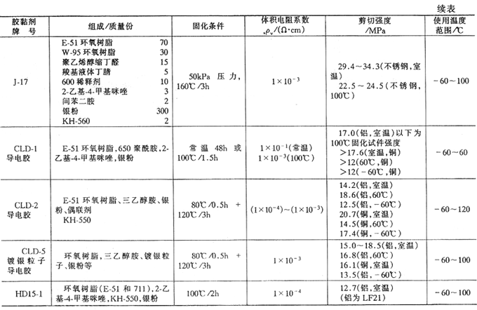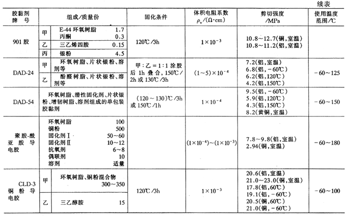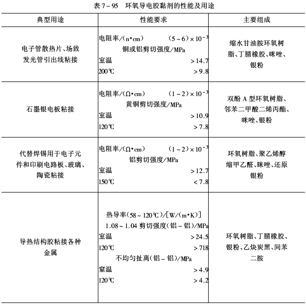 環(huán)氧導(dǎo)電膠黏劑由環(huán)氧樹脂、固化劑、導(dǎo)電填料、增韌劑、固化促進劑及其他助劑配制而成。環(huán)氧導(dǎo)電膠黏劑品種多、性能各異。典型環(huán)氧導(dǎo)電膠黏劑的配方及性能列于表7-94。