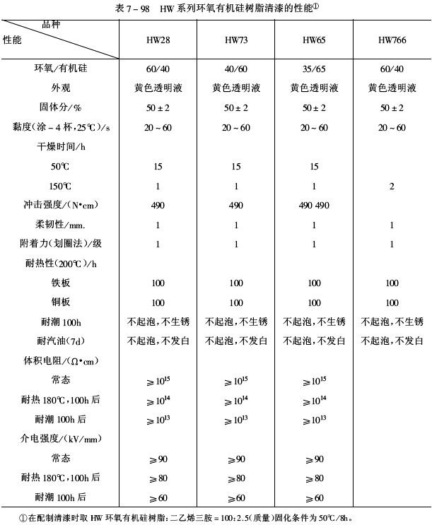 ①HW系列環氧有機硅樹脂含乙氧基硅中間物與E-20環氧樹脂反應得到HW28和HW73環氧有機硅樹脂;含乙氧基和羥基的硅中間物與E-20環氧樹脂反應得到HW65環氧有機硅樹脂;含羥基的中間物與E-20環氧樹脂反應得到HW766環氧有機硅樹脂。HW系列環氧有機硅樹脂清漆的性能見表7-98。