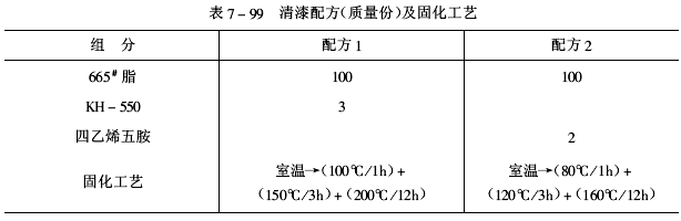 665#環氧有機硅樹脂清漆配方及固化工藝見表7-99,性能見表7-100。