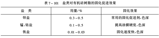 采用鐵、鈷、錳和鋅的辛酸鹽或環烷酸鹽作固化促進劑時,可有效地降低有機硅樹脂的固化溫度,其結果見表7-101。