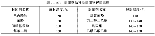 ②聚氨酯樹脂聚氨酯是以封閉型樹脂作為電氣絕緣涂料基料的,它在常溫下貯存穩定,在受熱時解封放出異氰根(-NCO),與體系中的羥基(-OH)等基團進行反應。這種基料的顯著優點是自焊性突出。常用的封閉劑品種及封閉物解封溫度見表7-103。