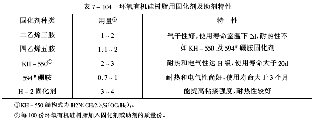 環氧有機硅樹脂常用固化劑及助劑的特性列于表7-104。