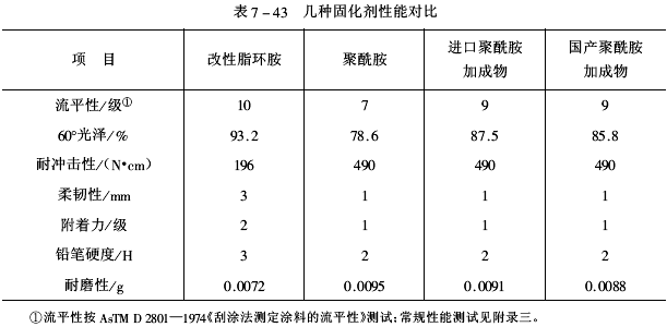 (2)固化劑 胺類固化劑是環氧地坪涂料的主要固化劑,有時根據需要也可選用合成樹脂固化劑。可供選擇的胺類固化劑有脂肪胺及其加成物、脂環胺及其加成物、聚酰胺及其加成物、曼尼希堿等含活潑氫的胺化合物。采用E-44環氧樹脂與改性脂環胺、聚酰胺、進口聚酰胺加成物和國產聚酰胺加成物按等當量配制清漆,測定流平性、光澤、沖擊性、柔韌性、附著力、鉛筆硬度和耐磨性,結果見表7-43。