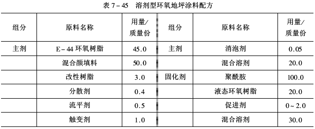 (1)配方組成溶劑型環氧地坪涂料是由主劑和固化劑構成的雙組分涂料(見表7-45)。