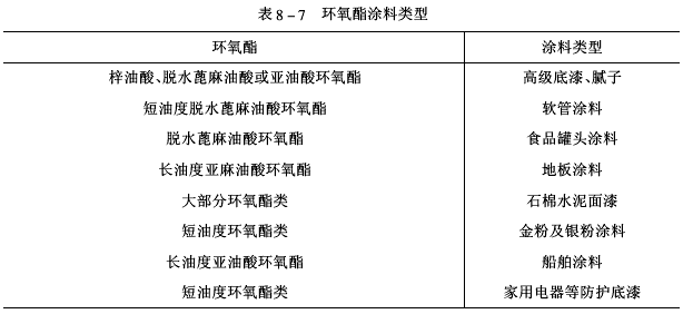 1.基料基料是環(huán)氧酯涂料的基礎(chǔ)材料。在配方設(shè)計(jì)時(shí),改變所用脂肪酸的品種和配比,以滿足涂料性能要求。配制常溫干型涂料時(shí),應(yīng)選用干性油脂肪酸環(huán)氧酯作基料,其酯化程度以60%~80%為宜;配制烘干型涂料時(shí),應(yīng)選用不干性油脂肪酸環(huán)氧酯作基料,其酯化當(dāng)量<0.5為宜。不干性油脂肪酸環(huán)氧酯常與氨基樹脂并用(不超過(guò)40%)制成耐化學(xué)藥品性好的淺色涂料。環(huán)氧酯可配制的涂料類型見表8-7。