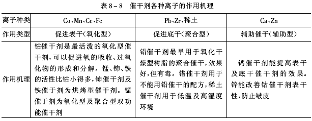 ②催干劑金屬離子的作用機(jī)理 催干劑各種金屬離子作用機(jī)理見表8-8。