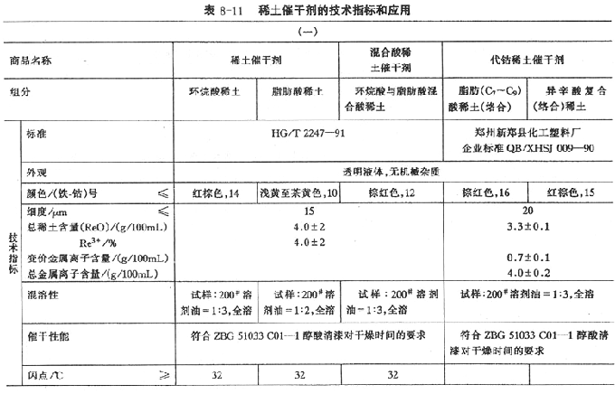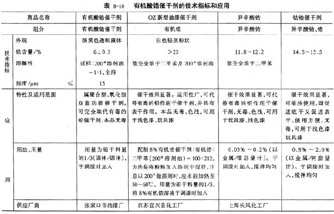 ![]() (2)催干劑的品種制造環(huán)氧涂料時(shí),可供選擇的催干劑有環(huán)烷酸金屬鹽催干劑(供應(yīng)廠商:上海長(zhǎng)風(fēng)化工廠、天津紅旗化工廠)、2-乙基己酸金屬鹽催干劑(供應(yīng)廠商:天津油漆助劑廠、河南新鄭縣化工塑料廠)、有機(jī)酸鋯催干劑和稀土催干劑,見表8-10、表8-11。