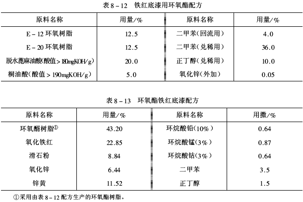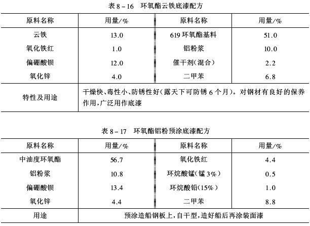2.環(huán)氧酯涂料相關(guān)品種環(huán)氧酯氨基底漆配方見表8-14、環(huán)氧酯氨基磁漆及清漆配方見表8-15、環(huán)氧酯云鐵底漆配方見表8-16、環(huán)氧酯鋁粉預(yù)涂底漆配方見表8-17和環(huán)氧酯鐵黑底漆配方見表8-18。
