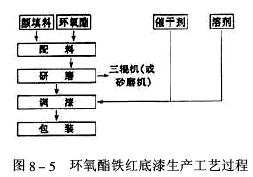 ![]() (3)生產(chǎn)操作將環(huán)氧酯鐵紅底漆配方中的環(huán)氧酯樹脂、滑石粉、氧化鋅、鋅黃和氧化鐵紅加入配料罐內(nèi),攪拌均勻后,進(jìn)行研磨分散。當(dāng)細(xì)度≤50μm時(shí),停止研磨。
