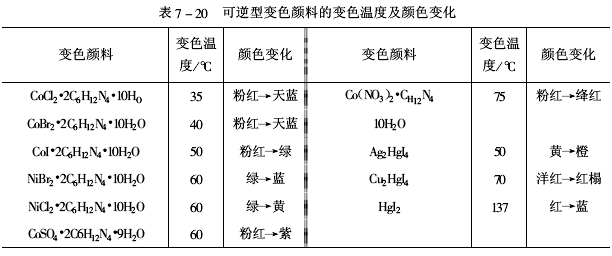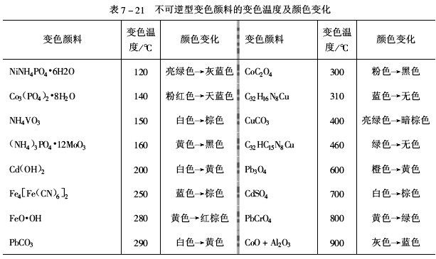 常用的變色顏料包括有機和無機兩大類,有機顏料耐溫性差,一般選作300℃以下的示溫涂料用,無機顏料耐溫性較好,一般選作300℃以上的示溫涂料用。表7-20和表7-21給出可逆型和不可逆型變色顏料的變色溫度及顏色變化,供選用時參考。