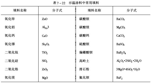 3.填料 填料在示溫涂料中是一種輔助材料,有些填料可使示溫涂膜顏色鮮艷穩定、色調均勻、調節變色顏料的變色溫度并能改善涂膜附著力。示溫涂料中常用的填料見表7-22。