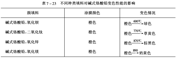 ![]() 另外,填料的品種對示溫涂料的變色性能也有影響。如表7-23所示,填料在不同溫度下,某些活化元素對變色顏料能起一種催化或抑制作用,當加入不同填料時,有導致變色溫度升高或降低的作用。