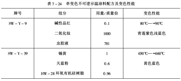 ①單變色不可逆示溫涂料單變色不可逆示溫涂料,多數只含有一種變色顏料,與適量的填料配合達到顯色清晰為準,一般顏填料占涂料總量的30%~50%,典型配方及變色性能見表7-24。