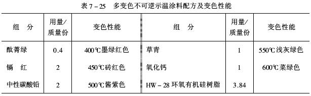 ![]() ②多變色不可逆示溫涂料多變色不可逆示溫涂料中,含有多種變色顏料,它們在不同的溫度區間可連續進行物理一化學變化,顯示出不同顏色。在航空工業應用最廣泛的SW-D-1示溫涂料中,含有五種變色顏料,可在400~600℃范圍內顯現五種顏色,起到良好的示溫效果,其配方及變色性能見表7-25。