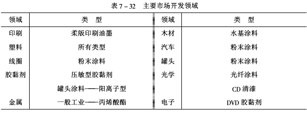 近年來,日本、北美、歐洲、中國等對輻射固化技術及其應用開展了更深入廣泛的開發研究,其主要市場開發領域見表7-32。