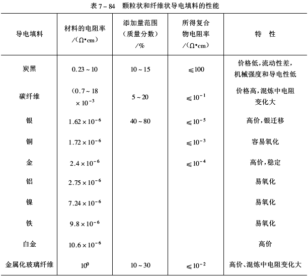 纖維狀導電填料品種有碳纖維、金屬纖維、金屬化玻璃纖維。幾種顆粒狀和纖維狀導電填料的性能見表7-84。