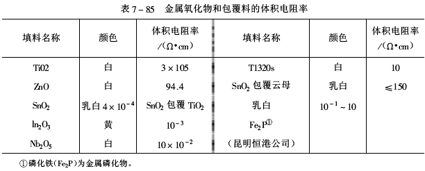 ③金屬氧化物及包覆料 金屬氧化物和包覆料的體積電阻率見表7-85。