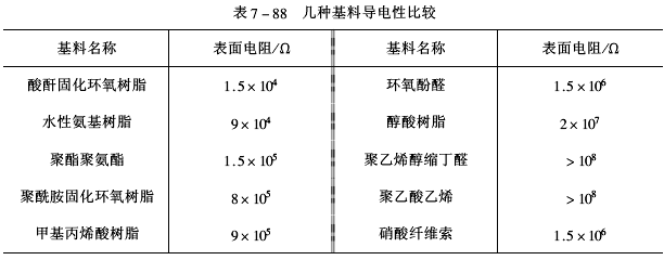 2.基料摻合型導電涂料的基料有時稱膠黏劑,是導電涂料的主要成膜物。幾種有機聚合物的體積電阻率列于表7-87。