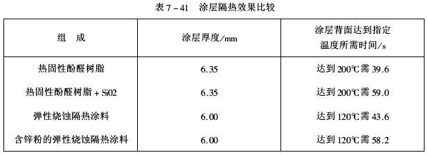 生成的SiO氣體離開隔熱涂層時帶走熱量,提高了隔熱效果。將熱性酚醛樹脂與二氧化硅配制成涂料;將乙烯基硅橡膠彈性燒蝕隔熱涂料中加入40%(占乙烯基硅橡膠質(zhì)量)活性鋅粉。涂層在氧-乙炔火焰(3002℃)中燒蝕,測定涂層隔熱效果比較見表7-41。