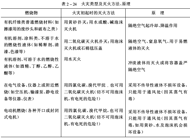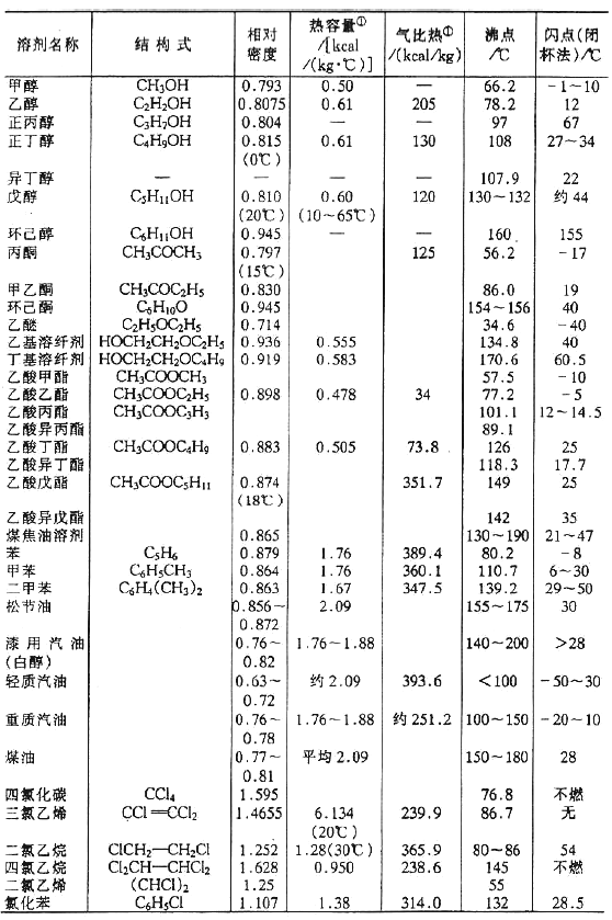 2.滅火方法滅火方法多種多樣,基本原理如下:移去或隔離已燃物的火源,使之熄火;隔絕空氣,切斷氧氣,使之自熄;將不燃性氣體(如二氧化碳)噴到燃燒物上,把空氣中的氧氣稀釋到<16%使之滅火;用冷卻法使燃燒物的溫度下降到著火點(diǎn)以下,即可滅火。涂裝車間的員工都應(yīng)熟知防火安全技術(shù),掌握滅火原理、火災(zāi)類型和滅火方法,學(xué)會使用消防工具。見表2-23和表2-24。涂料用有機(jī)溶劑的分子結(jié)構(gòu)、沸點(diǎn)、閃點(diǎn)、自燃溫度、爆炸極限和衛(wèi)生許可濃度等見表2-25。