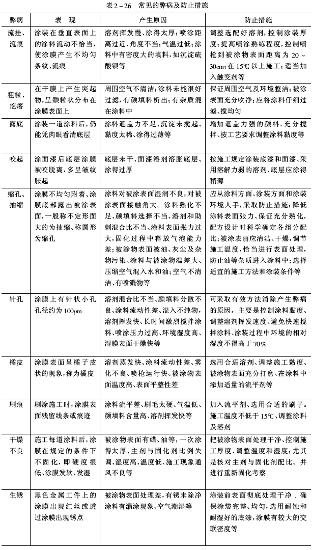 2.常見弊病及防止措施溶劑型環(huán)氧涂料在施工過程中或施工后不久,有時(shí)會產(chǎn)生弊病。常見的弊病表現(xiàn)、產(chǎn)生原因及防止措施列于表2-26。
