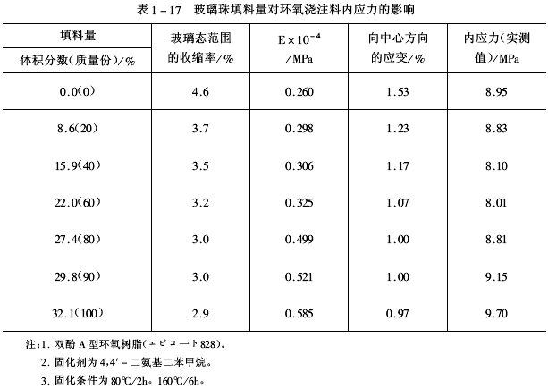 2.填料對(duì)內(nèi)應(yīng)力的影響采用雙酚A型ェピコ一ト828環(huán)氧樹(shù)脂、4,4′-二氨基二苯基甲烷(DDM),在(80℃/2h)+(160℃/6h)下固化,測(cè)試玻璃珠填料用量對(duì)澆注料性能的影響。從內(nèi)應(yīng)力實(shí)測(cè)值得知,填料開(kāi)始增加時(shí)內(nèi)應(yīng)力下降,用量超過(guò)22%使內(nèi)應(yīng)力回升,并呈現(xiàn)不連續(xù)的變化。試驗(yàn)結(jié)果見(jiàn)表1-17。
