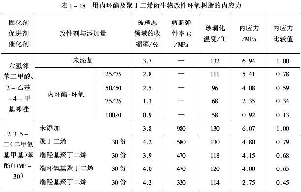 ![]() SOE的添加量增加,固化物的內(nèi)應(yīng)力會(huì)大幅度下降。SOE本身的內(nèi)應(yīng)力只有環(huán)氧樹(shù)脂的1/8。SOE與環(huán)氧樹(shù)脂等量配合時(shí)內(nèi)應(yīng)力下降40%。聚丁二烯衍生物也是降低固化物內(nèi)應(yīng)力的有效添加劑。用內(nèi)環(huán)酯及聚丁二烯衍生物改性環(huán)氧樹(shù)脂的內(nèi)應(yīng)力見(jiàn)表1-18。