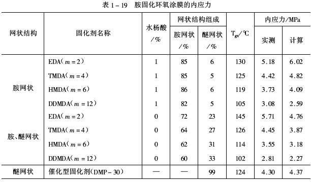 為固化劑、水楊酸為固化促進(jìn)劑、DMP-30為催化型固化劑制成環(huán)氧涂膜。其網(wǎng)狀結(jié)構(gòu)組成、玻璃化溫度(Tgx)和內(nèi)應(yīng)力數(shù)據(jù)列于表1-19。