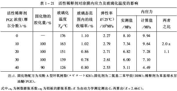 ![]() 3.活性稀釋劑對(duì)涂膜內(nèi)應(yīng)力的影響 在4,4′-二氨基二苯基甲烷(DDM)與ェピコ一ト828環(huán)氧樹(shù)脂構(gòu)成的固化體系中添加苯基縮水甘油醚(PGE)活性稀釋劑時(shí),PGE用量達(dá)到40%的Tgx為126℃,涂膜內(nèi)應(yīng)力為5.11MPa;不添加PGE的涂膜的Tgx為176℃、內(nèi)應(yīng)力為8.10MPa。即添加PGE 40%后比不添加PGE的涂膜Tgx下降了50℃、內(nèi)應(yīng)力下降約為63%。活性稀釋劑加入量的增加固化產(chǎn)物的玻璃化溫度和內(nèi)應(yīng)力隨之下降,結(jié)果見(jiàn)表1-21。
