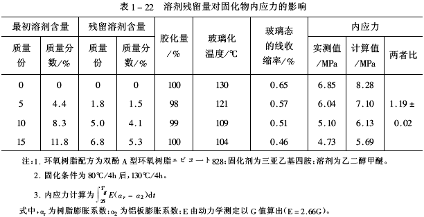 ![]() 4.溶劑對(duì)涂膜內(nèi)應(yīng)力的影響采用三亞乙基四胺作固化劑,當(dāng)產(chǎn)物的膠化量達(dá)到或接近100%形成網(wǎng)狀結(jié)構(gòu)時(shí),溶劑在固化物內(nèi)的殘留量對(duì)內(nèi)應(yīng)力影響甚大。其結(jié)果見(jiàn)表1-22。
