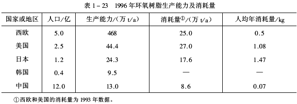 環氧樹脂體系的應用原理及應用技術已成為專業技術學科。改革開放以來,在企業自身機制創新、科研開發和技術引進的基礎上,環氧涂料應用領域迅速擴大、技術水平明顯提高、產品質量不斷提升,環氧涂料基本上滿足相關行業的需求。但與世界先進國家相比,尚存差距;國內各地區間發展也不平衡。不同國家或地區的環氧樹脂生產能力及消耗量見表1-23。