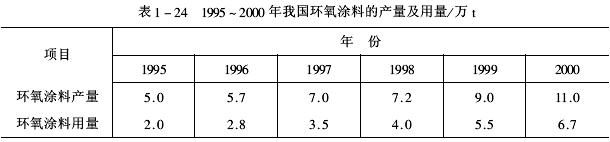 1995~2000年我國環氧涂料的產量及用量見表1-24。