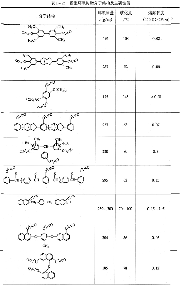 最近人們開發的熔融黏度低、吸水率低、耐熱性好的雙官能度和多官能度的新型環氧樹脂見表1-25。