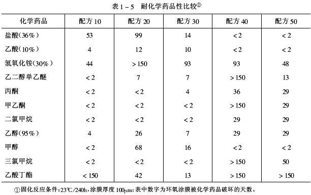 ![]() 由表1-5知,配方40由于環氧官能度高,因而交聯固化涂膜的交聯密度大,耐化學藥品性能突出,但因涂膜內的氨基氮原子易受酸類進攻,則耐酸性差。值得注意的是,只有酚醛環氧樹脂涂膜有稍好的耐酸性和耐甲醇性。